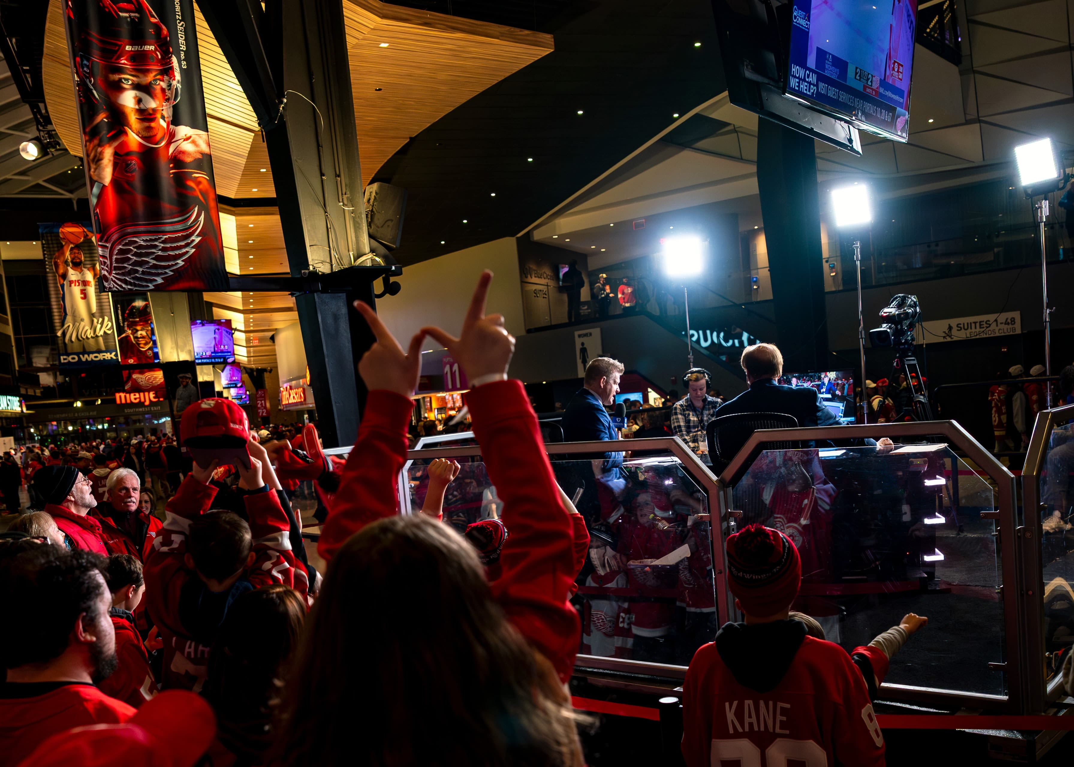 Fans shouted and cheered as they passed by the broadcast desk on the concourse floor of Little Caesars Arena before the Detroit Red Wings took on the Utah Hockey Club. While some were cheering for the Red Wings, others were cheering for the man at the desk.