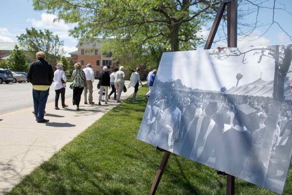 Student guides led participants through a tour and were reminded that many current campus buildings did not exist in the 1960s. The tour ended at Lake Michigan Hall, Grand Valley’s first building, where classmates lined up in pairs and headed to lunch under a large striped tent on the marching band practice field, recreating the walk they took on their commencement day.