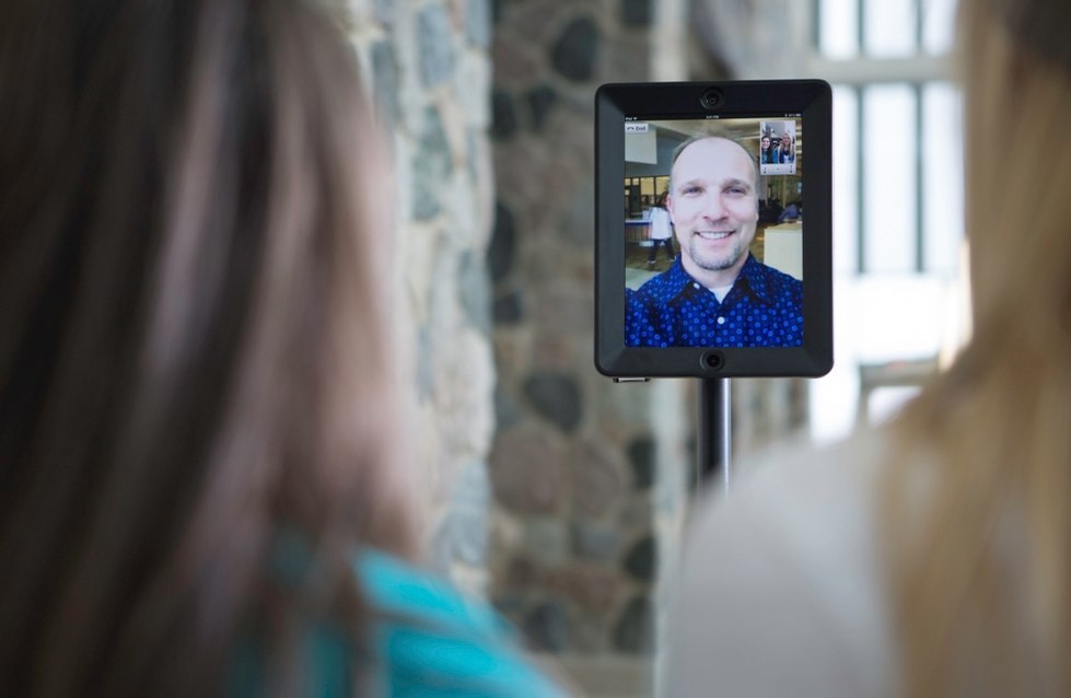 Eric Kunnen, the emerging technologies coordinator for the Technology Showcase, is shown on the Double Robotics device.