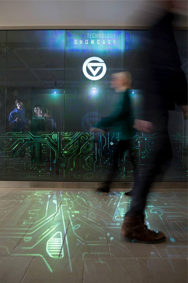 Images are projected from inside the Technology Showcase to the floor to draw students inside.
