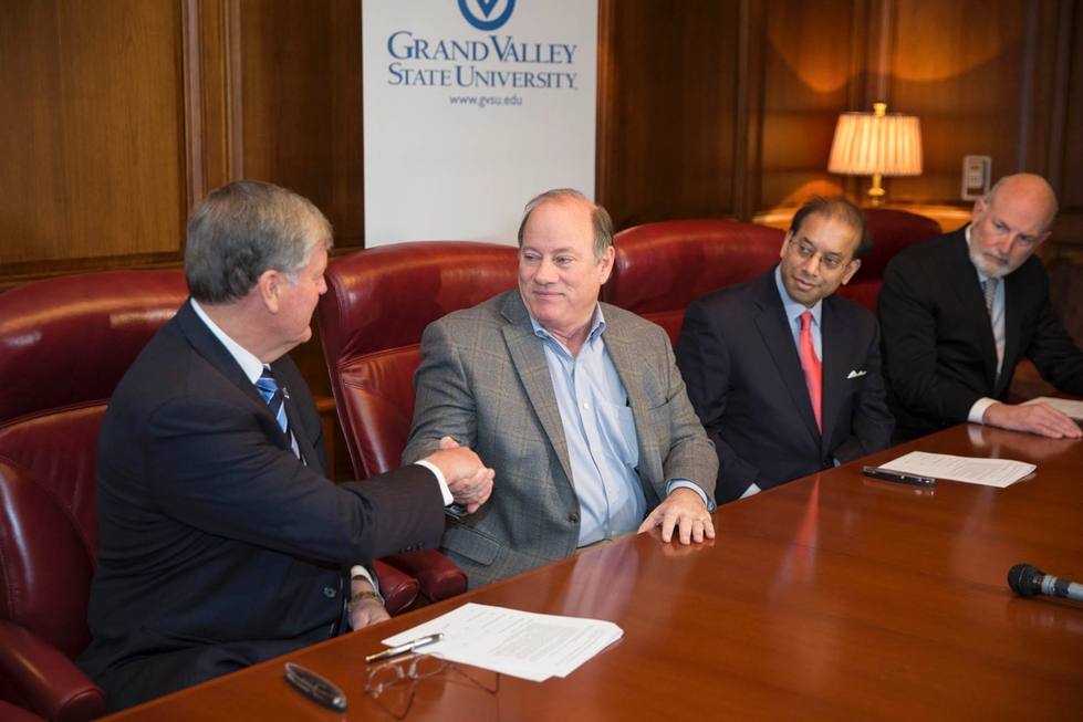 President Thomas J. Haas shakes hands with Detroit Mayor Mike Duggan after signing paperwork making the university a partner in the Detroit Promise, and making it easier for more Detroit high school students to attend Grand Valley. At far right is Sandy Baruah, CEO of the Detroit Chamber. (Elizabeth Lienau)