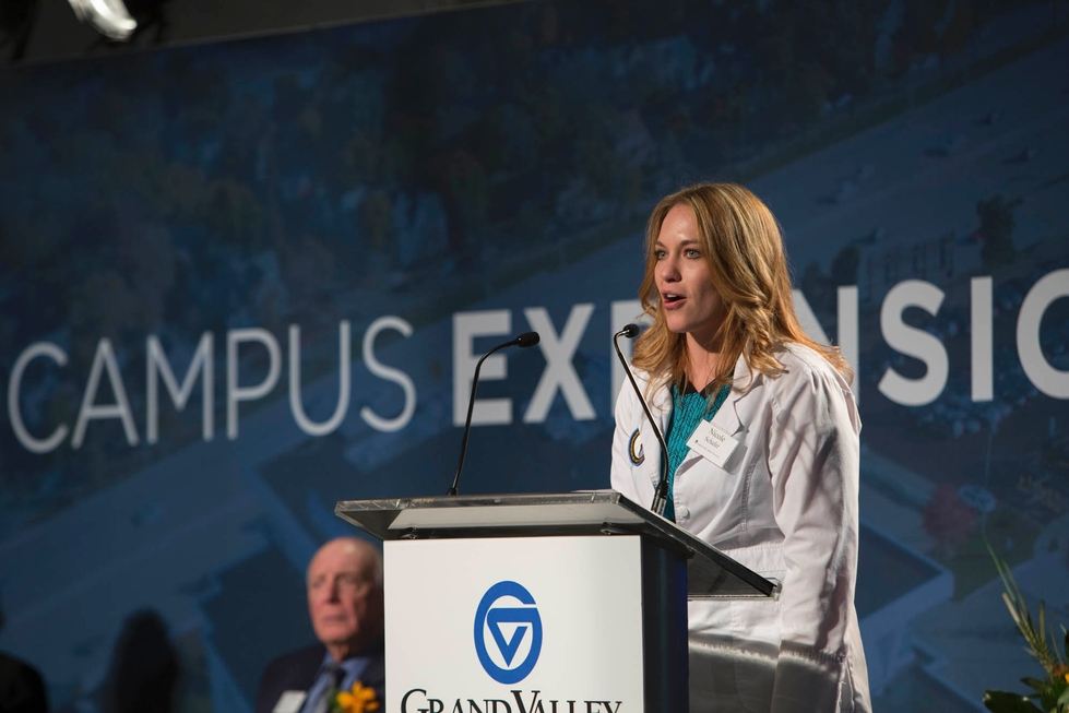 During the groundbreaking ceremony, President Thomas J. Haas spoke of the imperative for Grand Valley to expand its health campus.