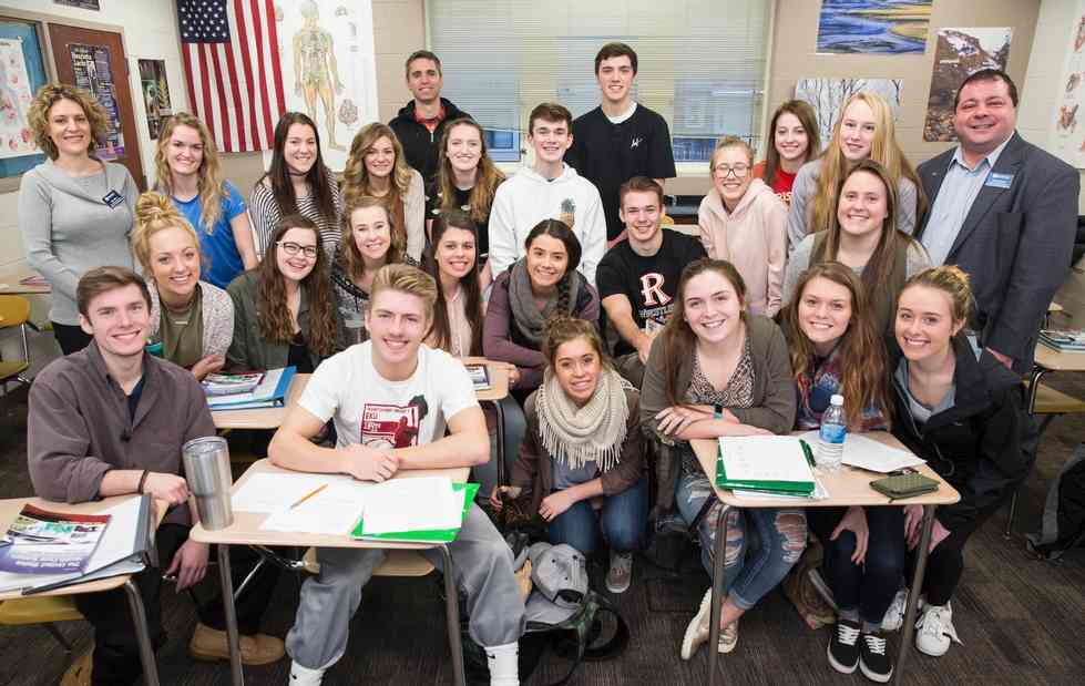 Rockford High School students enrolled in the early college program are pictured with Grand Valley faculty members Chad Sutliffe and Julie Alles-Grice, and their teacher, Rick Folcik.