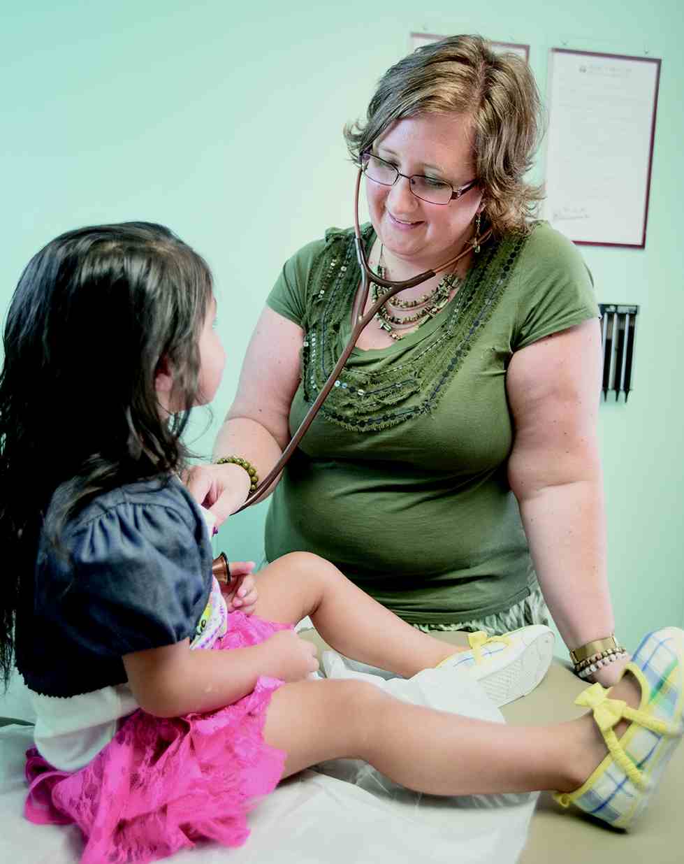 Amy Werling, ’07, a physician assistant at the Sparta Health Clinic, examines 3-year-old Aanii Rivera. photo by Amanda Pitts