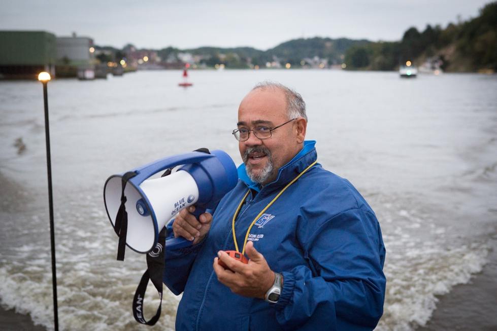 Head coach John Bancheri uses a megaphone on the water.
