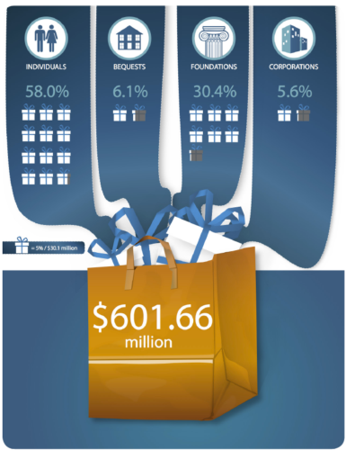 More than half of all donations came from individual donors, making up $348.78 million of the total in 2010.