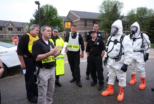Local emergency responders used Grand Valley State University’s Allendale Campus to take part in a discussion session and chemical suicide test drill.