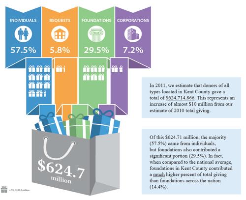 Donors in Kent County gave an estimated $624.7 million to charity and philanthropic groups in 2011, a new report from Grand Valley State University’s Johnson Center for Philanthropy shows.
