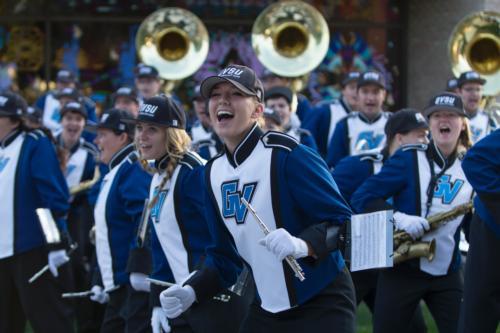 Following their Rosa Parks Circle performances, the marching band, dancers and participants in the WGVU/PBS Nerd Walk will proceed in cadence through downtown and across the Blue Pedestrian Bridge to the L.V. Eberhard Center on Grand Valley’s Pew Grand Rapids Campus where the band will perform a second time.