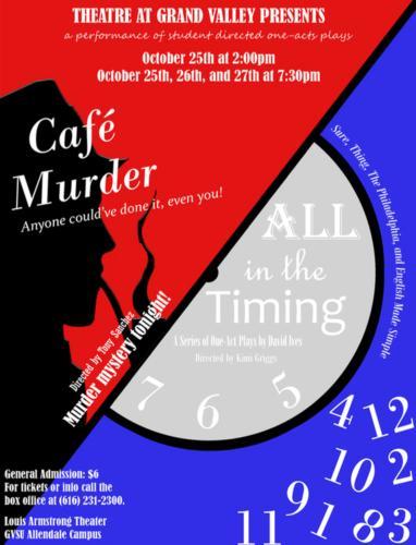 Performances of “Café Murder” and "All in the Timing: A Collection of One-Act Plays by David Ives" will take place October 25 at 2 p.m. and 7:30 p.m., and October 26 and 27 at 7:30 p.m. in the Performing Arts Center's Louis Armstrong Theatre on the Allendale Campus.