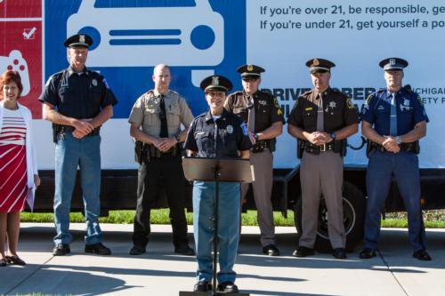 Law enforcement officials from Grand Valley, Ottawa County, Kent County and the Michigan Office of Highway Safety Planning [(MOHSP)] gathered on the Allendale Campus August 21, to kick off the statewide "Drive Sober or Get Pulled Over" campaign.