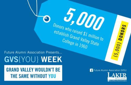 The Future Alumni Association will host the third annual GVS(You) Week February 16-20 to raise awareness about and celebrate the thousands of donors who support and give to Grand Valley each year.