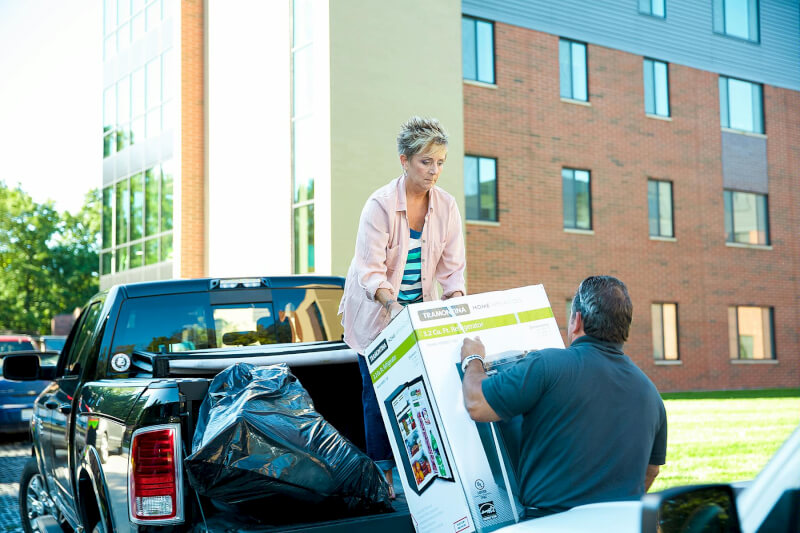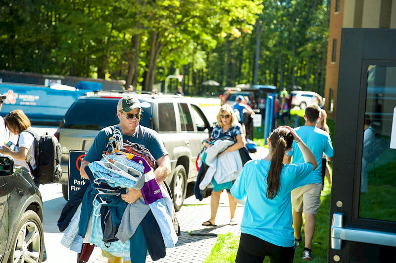 The students and their families are greeted by hundreds of alumni, faculty and staff members, who give a helping hand during move-in week. President Thomas J. Haas and his wife, Marcia, will serve ice cream to families and new students tomorrow at 11 a.m. by Kleiner Commons.
