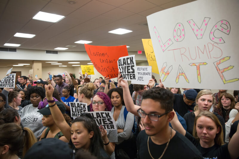 The campaign event, organized by the university's College Republicans student organization, drew a crowd of several hundred people to the Grand River Room. Trump supporters and opponents chanted over each other dozens of times throughout the event.