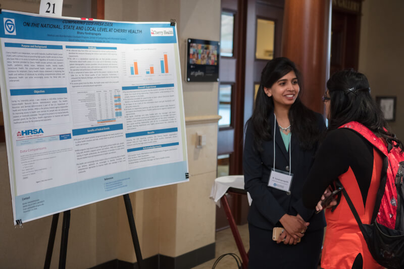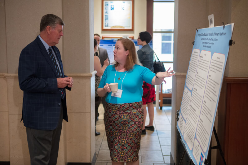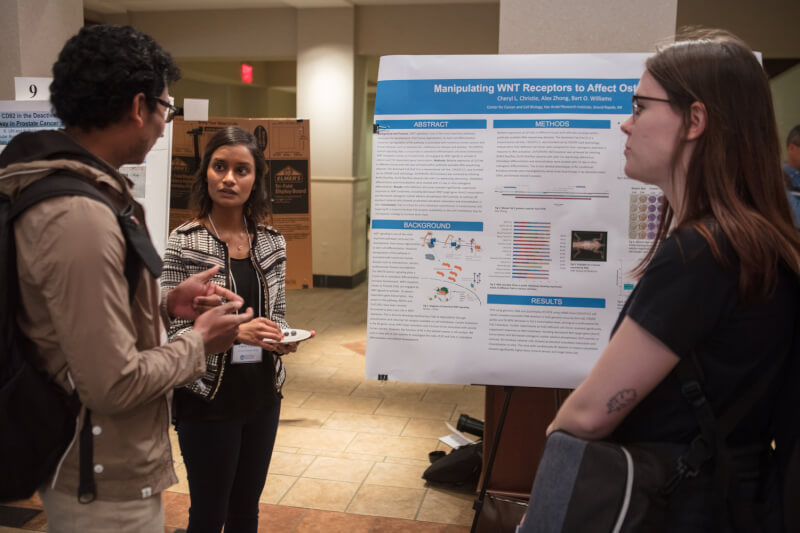 Students gave poster presentations to explain their research methods and conclusions. Topics included cancer research, local government and affordable housing, osteogenesis research, bilingual family literacy programs, undergraduate women who abandon STEM majors, and the impact of graduate leadership on land management work, to name a few.