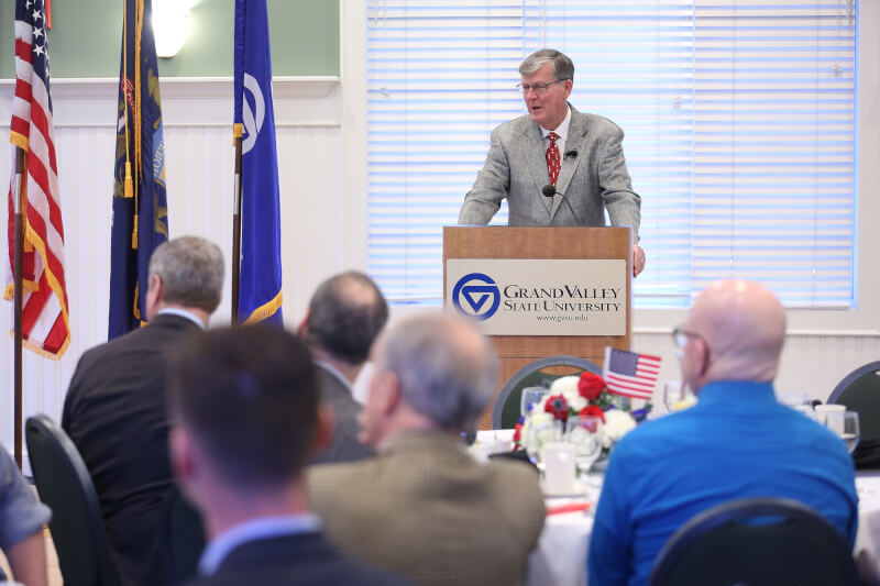 Haas thanked all veterans who served in the U.S. Army, Navy, Air Force, Coast Guard and Marines, as well as ROTC students. He highlighted support services, including a grant Grand Valley recently received to establish a TRIO Veterans Upward Bound program that will support veterans with degree completion.