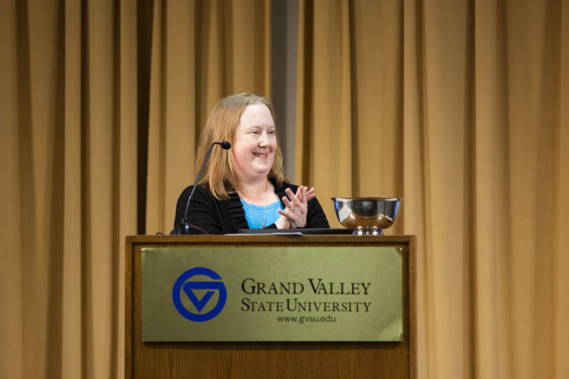 The commission presented its Maxine Swanson Award to Jennifer Palm, assistant to The Graduate School; Unsung Hero Award to Autumn Gorsline-Davis, academic department coordinator for Modern Languages and Literatures; and the Community Impact Award to Allison Ford, head coach of Grand Valley’s synchronized skating team.