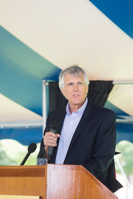 Mark Zumberge, youngest son of James Zumberge, Grand Valley's first president, spoke at a luncheon that was held in a tent made to replicate the setting of the first commencement ceremony in 1967.