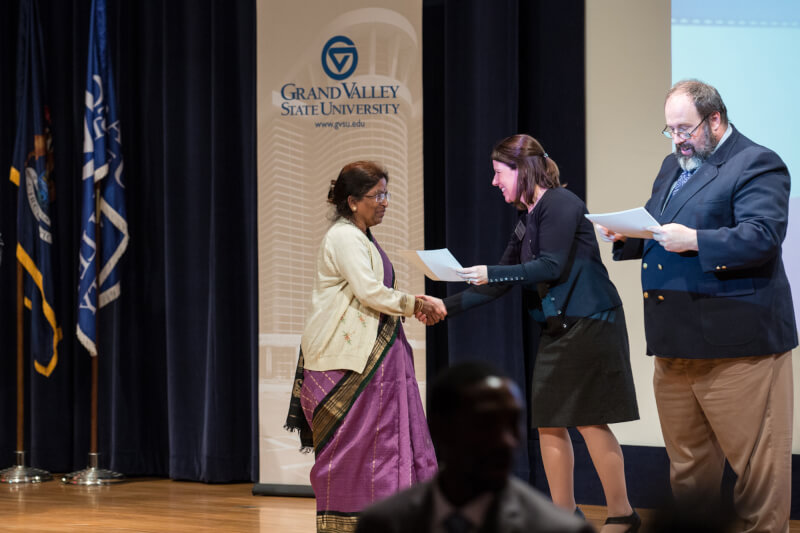 The naturalization ceremony was hosted by students in Grand Valley's international relations program. Polly Diven, professor of political science and director of the IR program, said it's the second time the ceremony has been at Grand Valley's Pew Grand Rapids Campus.