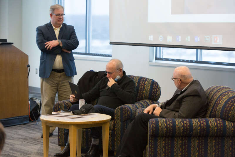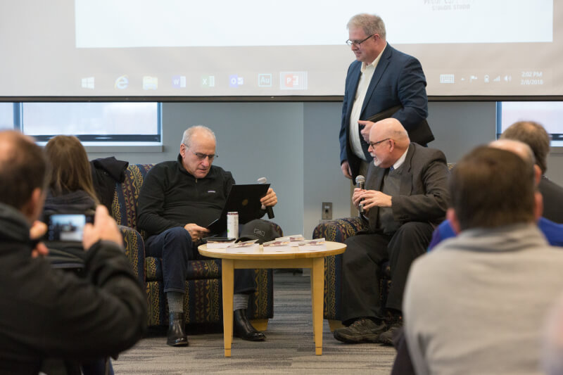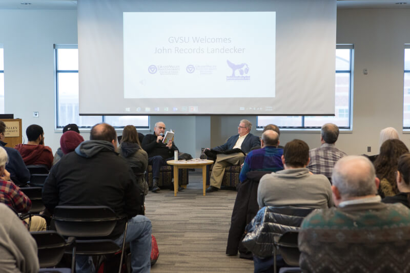 Landecker visited the Allendale Campus February 8 to discuss his life, career and autobiography, Records Truly Is My Middle Name. What he didn't know was that following his talk, he would be presented with a diploma by Fred Antczak, dean of the College of Liberal Arts and Sciences.