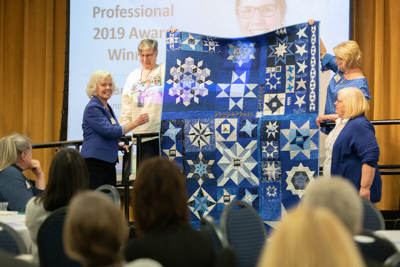 In a pattern of stars, the Laker blue, black and white quilt was presented to Haas March 27 during the Celebrating Women Awards ceremony in the Kirkhof Center.