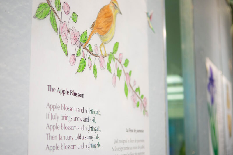 Given that the original book was intended for children, Strom began illustrating the poems and compiling some of her translations and illustrations into a manuscript for a children’s poetry book, pages from which make up the “Apple Blossom and Nightingale” exhibit.