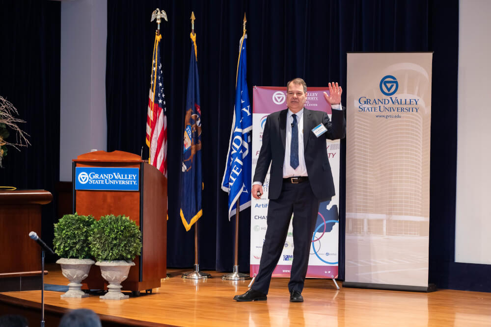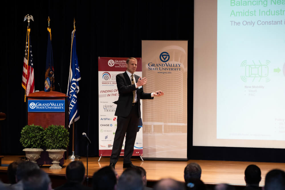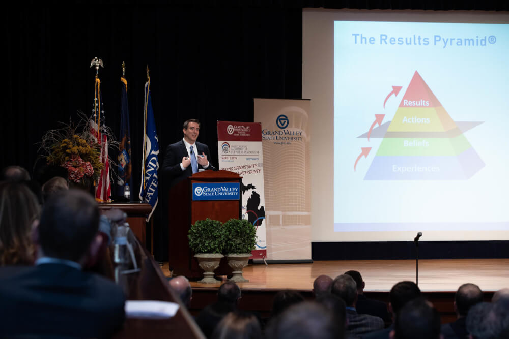 The event was held in Loosemore Auditorium in the DeVos Center on the Pew Grand Rapids Campus, with the theme, "Finding Opportunity in the Uncertainty."