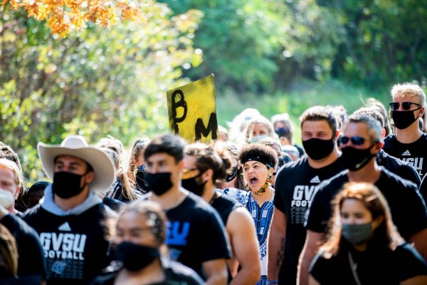 Dressed in black, wearing face coverings and shouting “Black lives matter,” members of the Grand Valley community marched through the Allendale Campus in solidarity for racial equality.