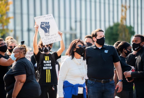 More than 100 students, faculty and staff members participated in the student-led march through campus on Friday, October 9. They were joined by President Philomena V. Mantella and several other university leaders.