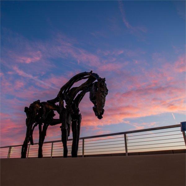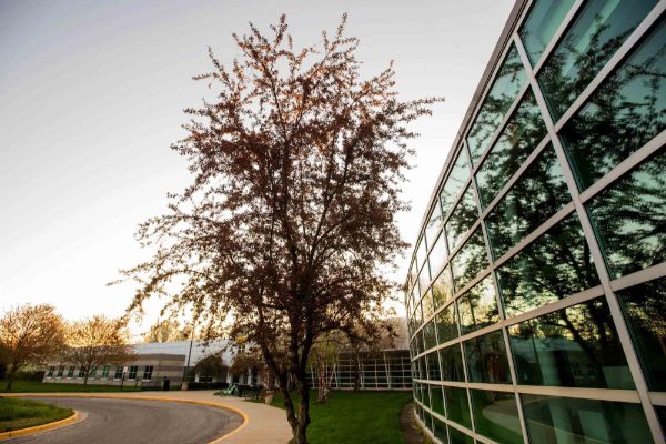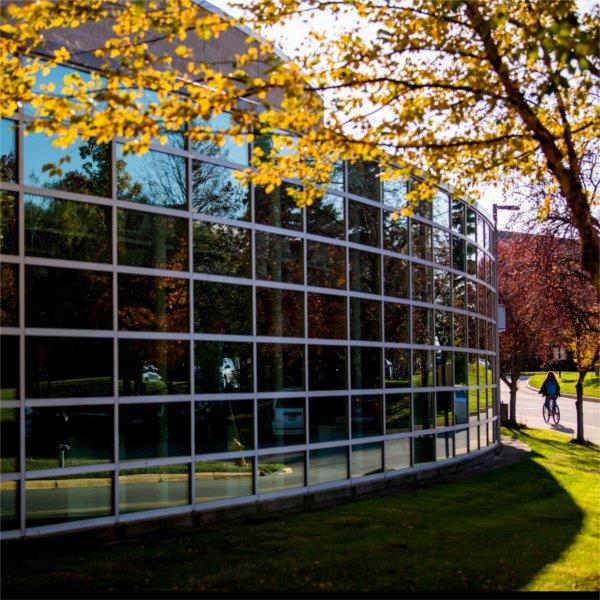 The outside of the Calder Art Center, including glass-paneled walls and a tree.