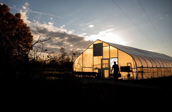 Left: Michael Hinkle, farm manager and educator at GVSU's Sustainable Agriculture Project, hauls compostable material to a hoop house as preparations to winterize the farm is underway earlier this month.