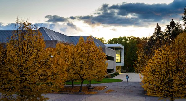 A person walks through Grand Valley's Allendale Campus near Au Sable Hall on a fall day.
