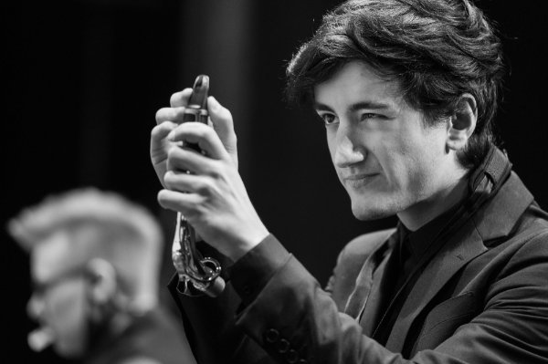 Right: Student and New Music Ensemble member Linus Guerra readies his saxophone mouthpiece for a performance on November 18.
