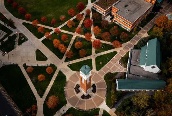 Left: The Cook Carillon Tower is seen against a vibrant autumn morning sky on the Allendale Campus.