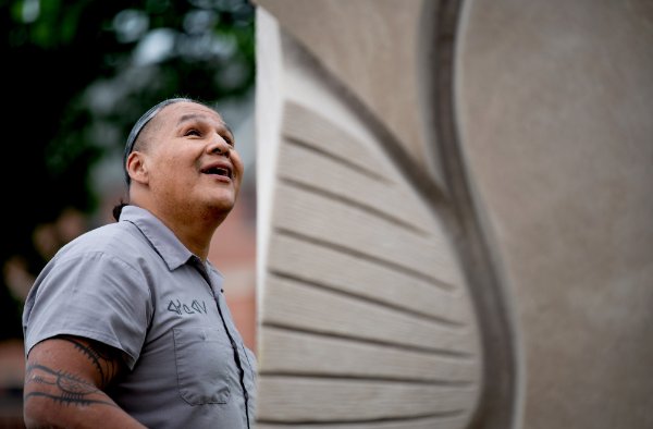 A new sculpture commissioned by Grand Valley for the Pew Grand Rapids Campus was created by a descendant of the original people of this area to show the connectedness of humanity.
