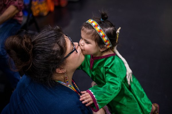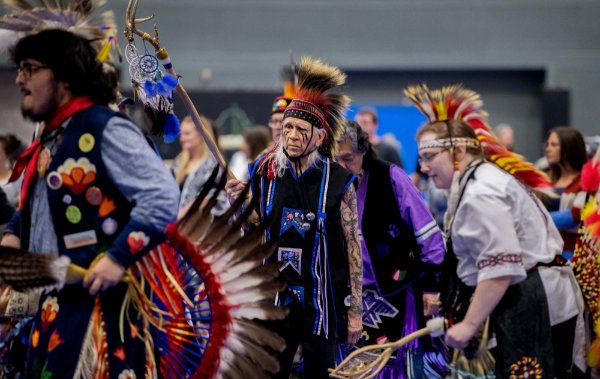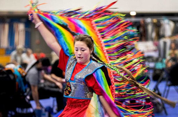 Vyana Slattery, center, dances during the Pow wow. Slattery's Native