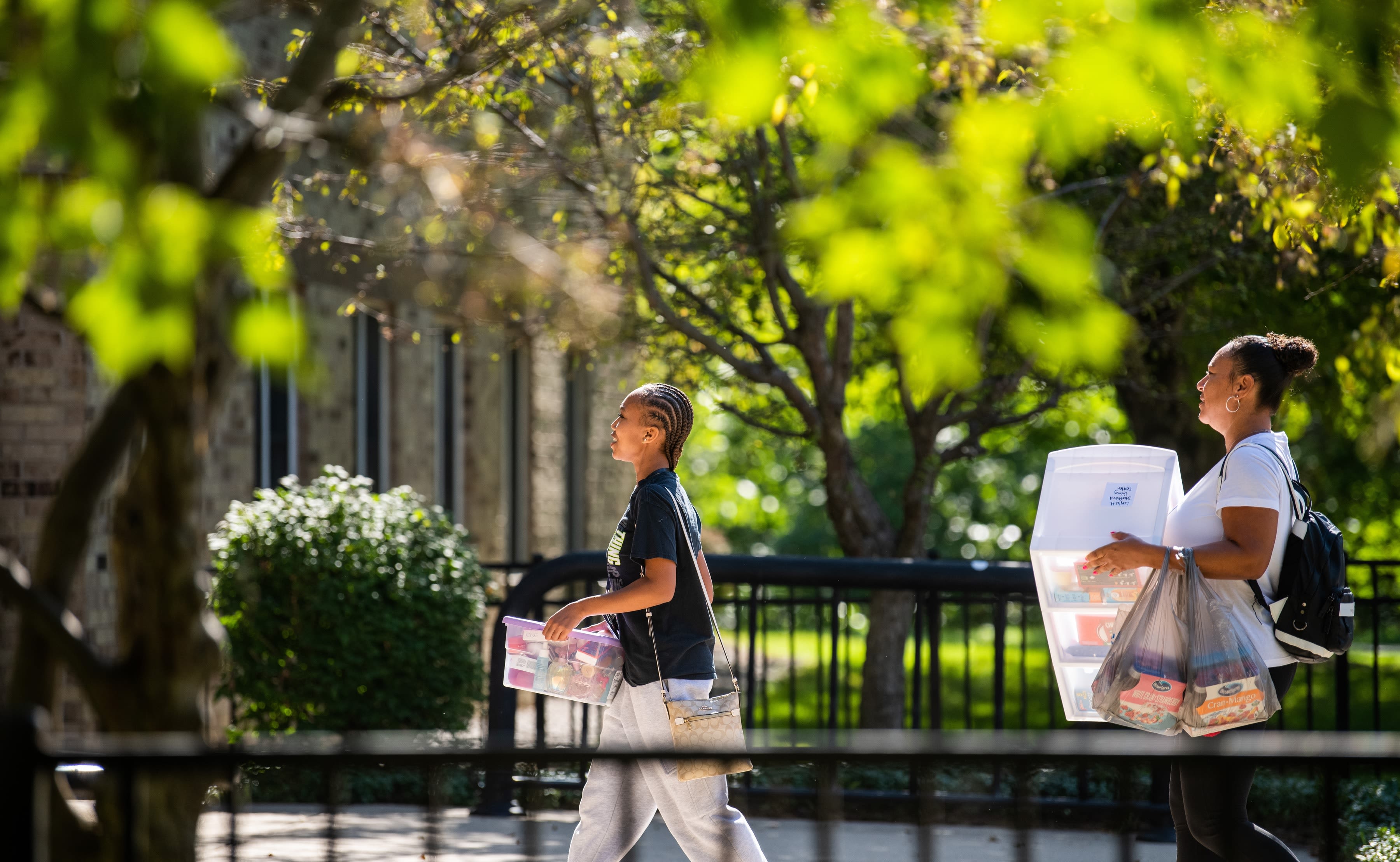 Layla Hoskins, left, along with her mom Tonya Hoskins, carry belongings into her living center during move-in.