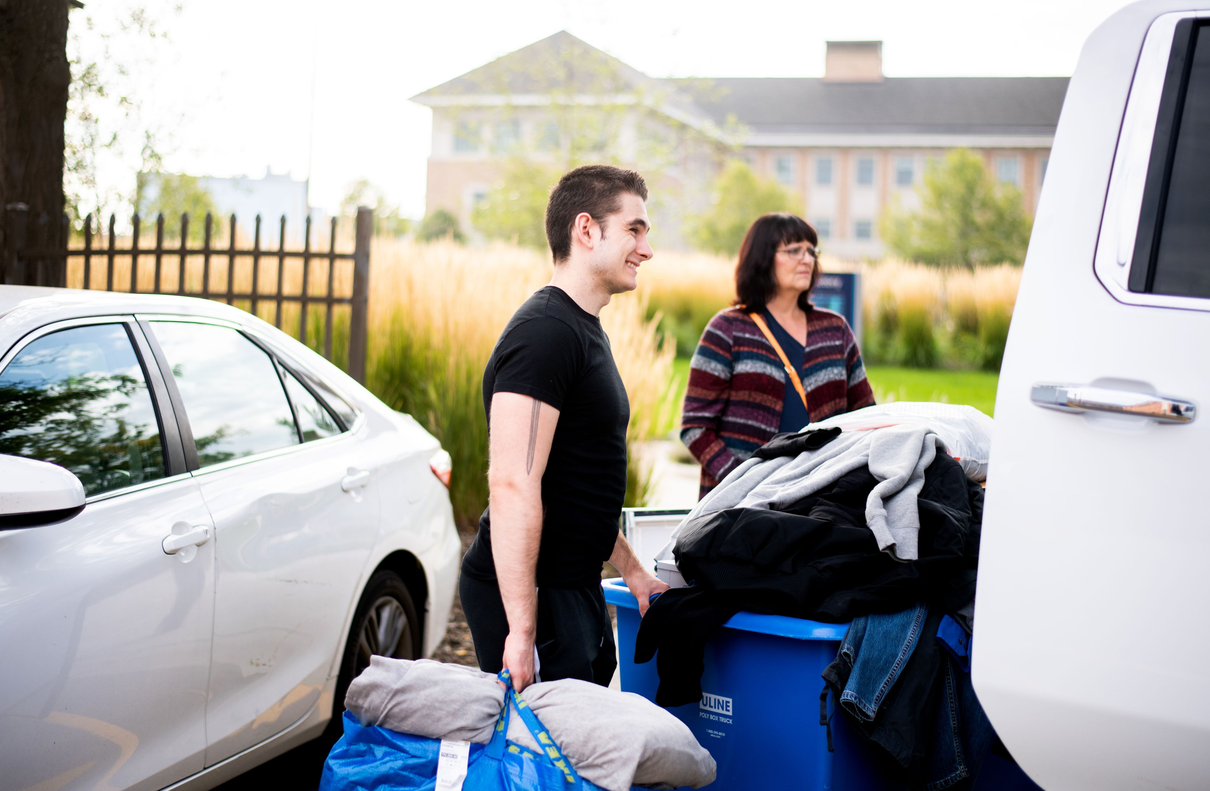 Landon Mesler, left, gets help unloading belongings from Mesler's grandmother, Debbie Duncan, during move-in.