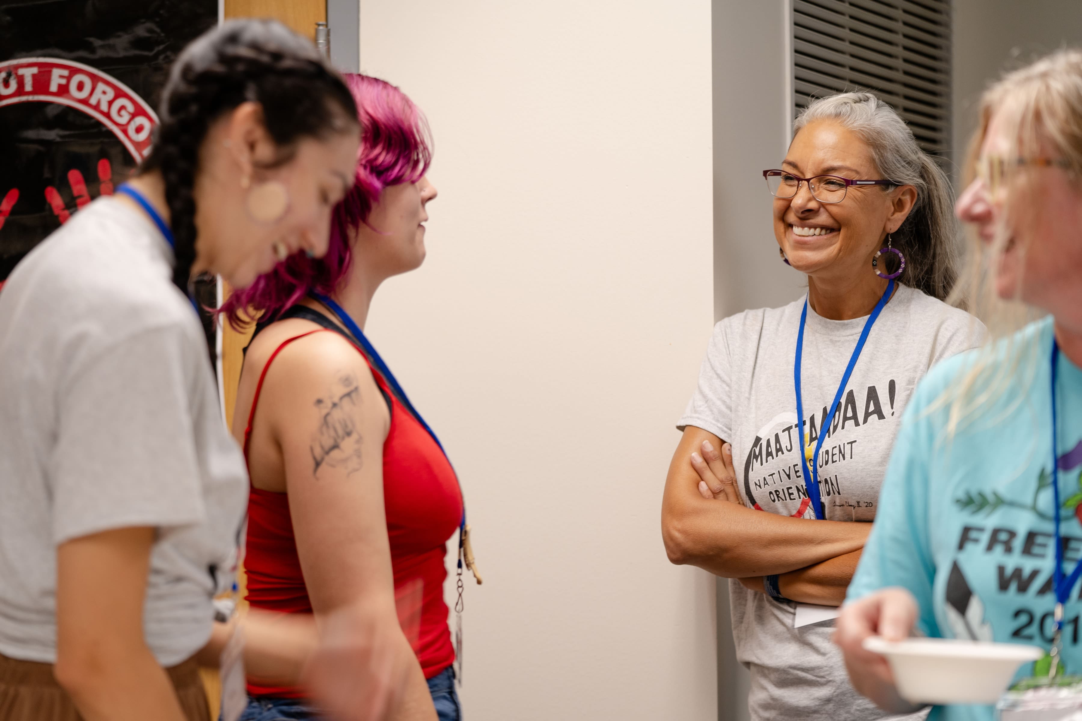 Lin Bardwell, assistant director of the Office of Multicultural Affairs, talks with students during Native American Maajtaadaa! Student orientation.