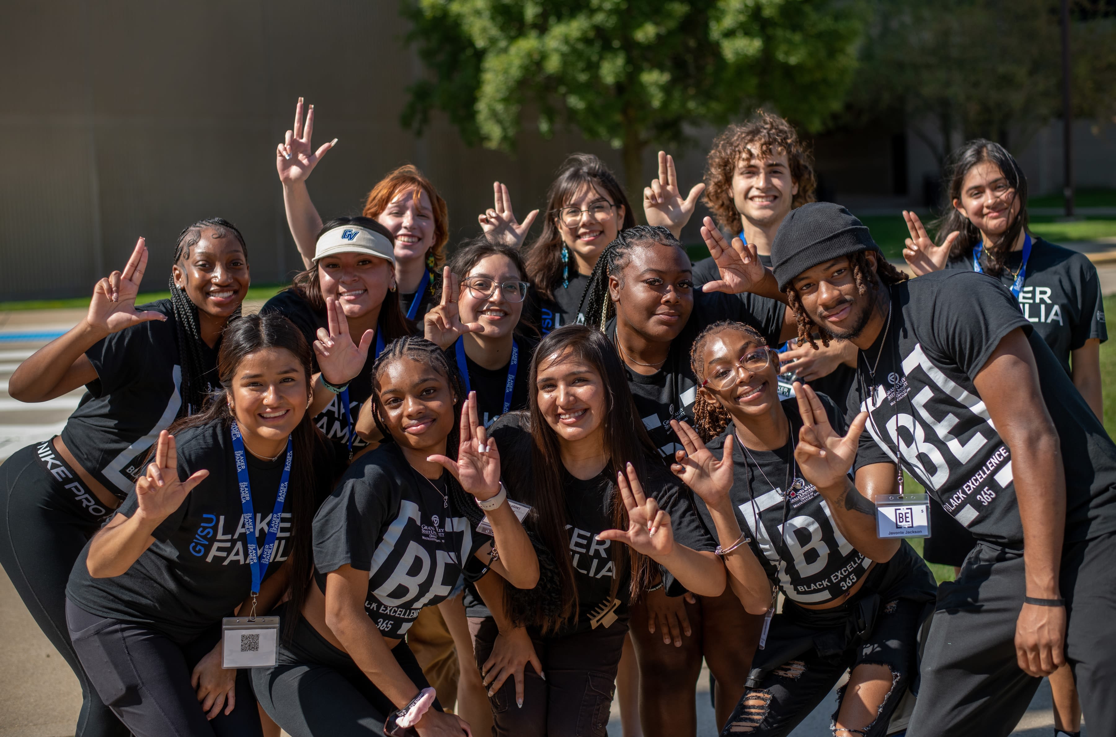 Students from Laker Familia and Black Excellence affinity groups pose for a photo during move-in.