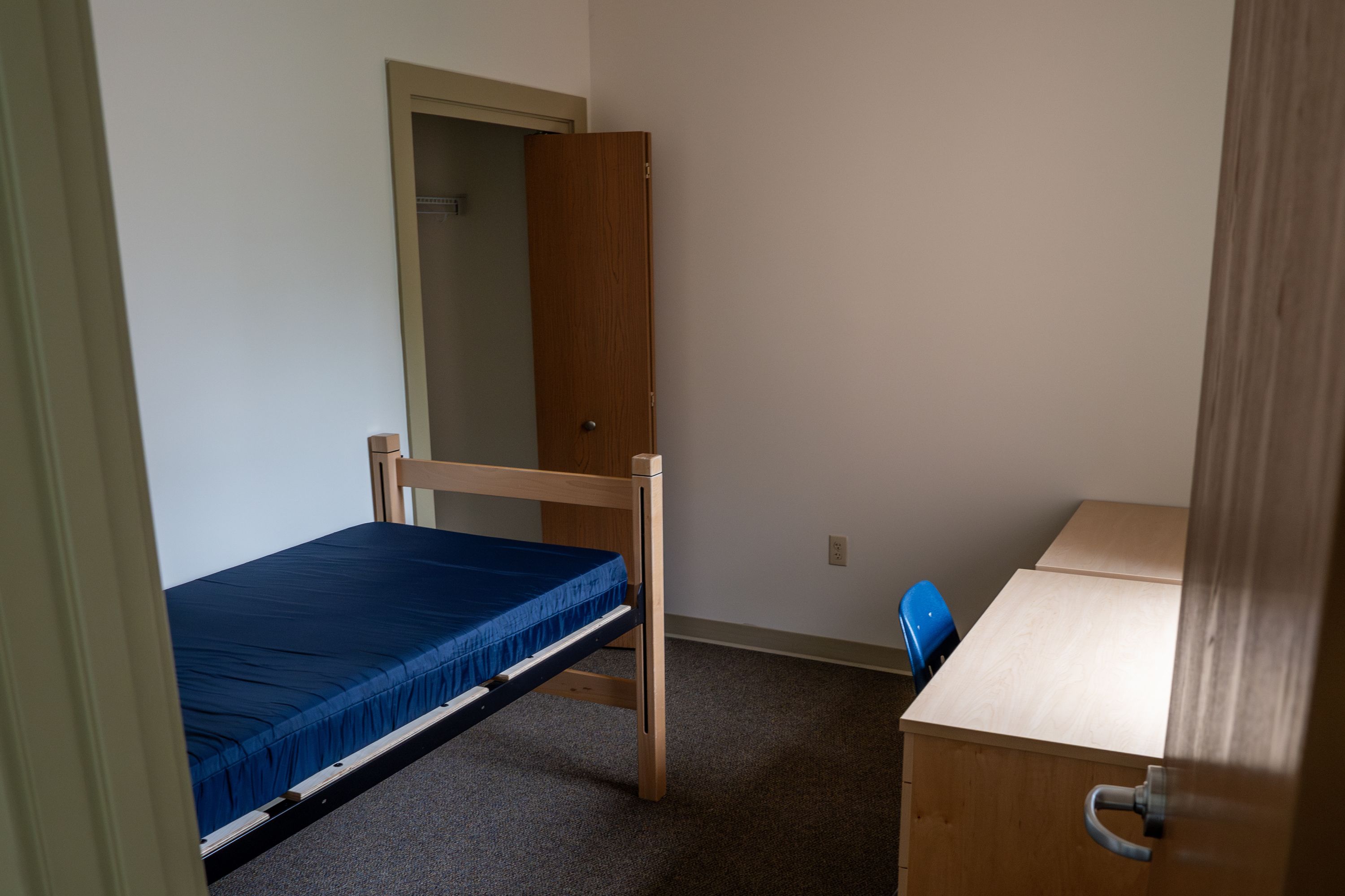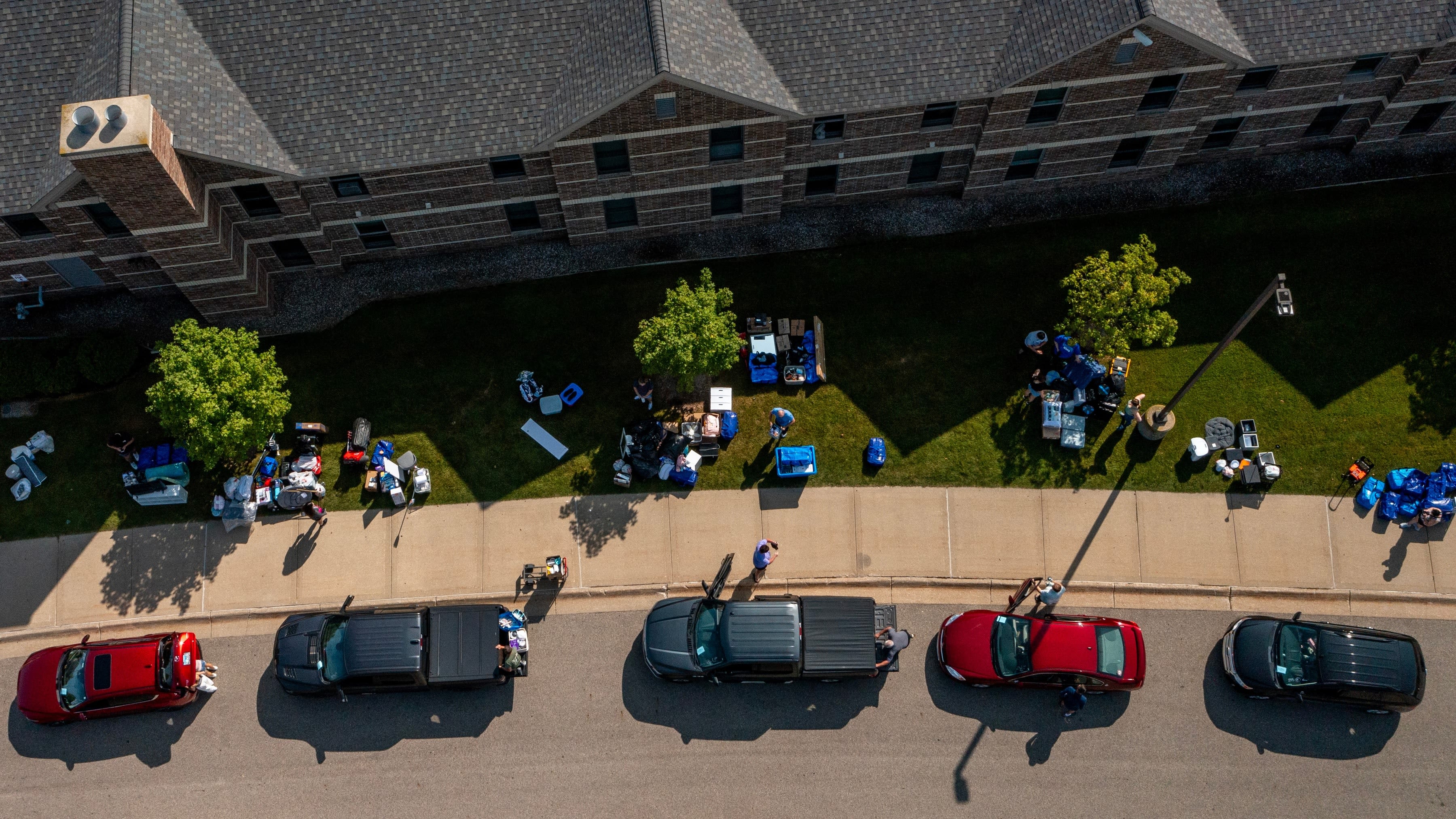 Over at the Frey Living Center, a first-year student, Camden Stec, and his family were gathering his belongings on the lawn after a three-hour drive from their home in southeast Michigan.