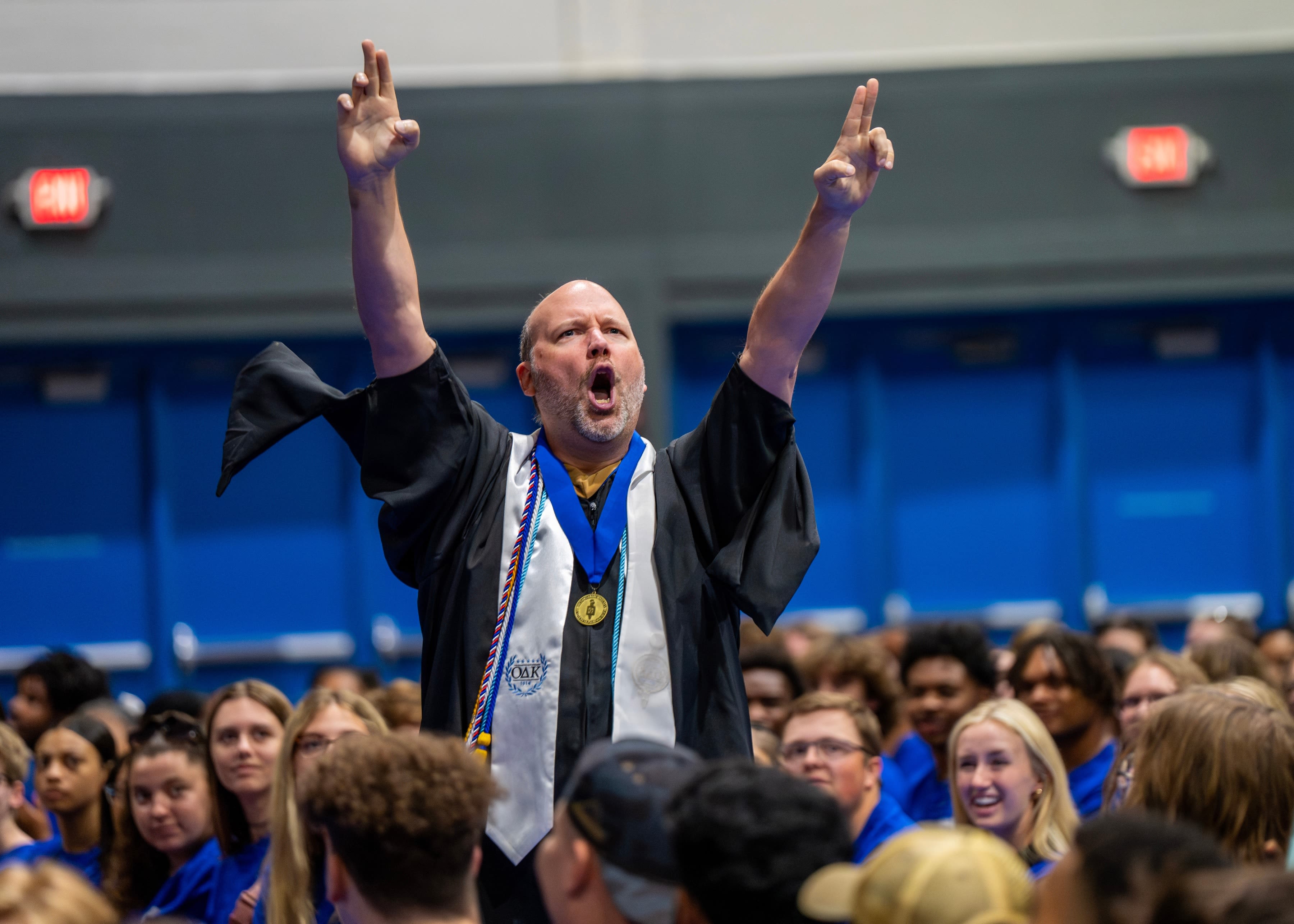 Gerry Cooke, program director of mentorship for the Seidman College of Business, pumps up the audience while processing with other faculty and staff members.