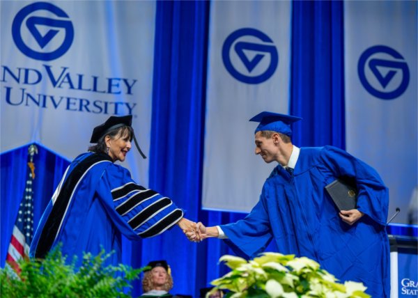 President Philomena V. Mantella welcomed graduates and commended the courage and persistence they displayed throughout their time at Grand Valley, which was impacted by the COVID-19 pandemic.