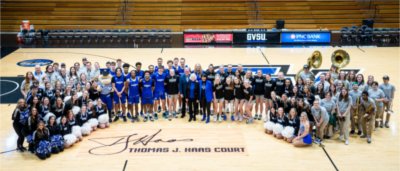 More than 300 GVSU supporters, friends and family members of Haas joined President Philomena V. Mantella, Director of Athletics Keri Becker and university and athletic administrators for the official unveiling of the Thomas J. Haas Court, prior to the Lakers men’s and women’s basketball games against Lake Superior State University.