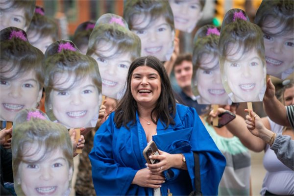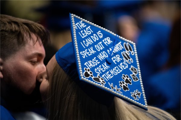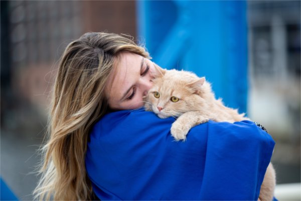 Soon-to-be graduate Jersey Legg cuddles her cat, Hibiscus, on the Blue