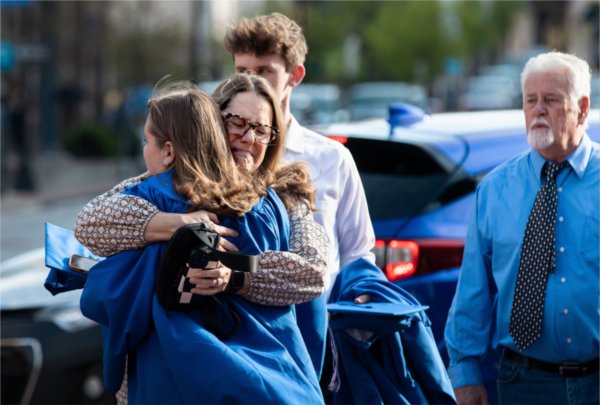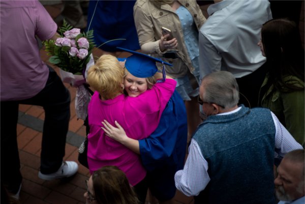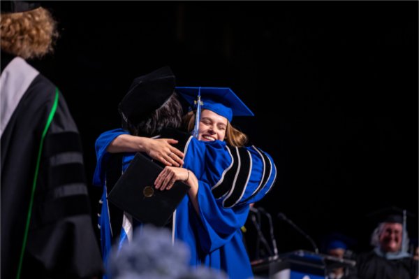 Anna Lindeboom hugs President Philomena V. Mantella as she crosses the