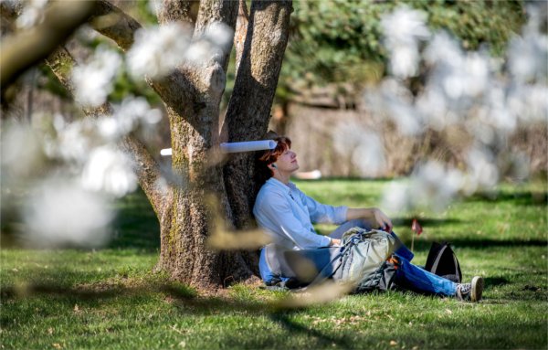 soaks up the sunshine while sitting under a tree in the Arboretum April