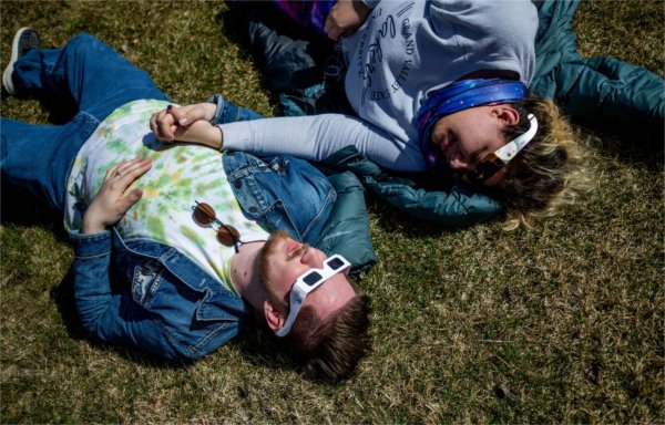 Students Gerrit Mitchell and Kristen Gretka hold hands while viewing the