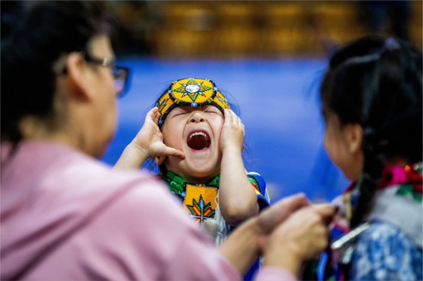 Adrian Pitawanakwat-Warner, 4, center, tries to make his sister laugh