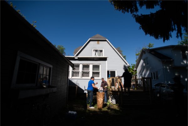 A Laker crew of student veterans and Division of Student Affairs staff members volunteered their time May 10 to improve the backyard and sand the deck of a Grand Rapid house owned by an Air Force veteran who is a single mother.